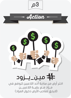 بهذا الكرت تستطيع إختيار أرض من ساحة أحد اللاعبين و يتم المزايدة عليها من باقي اللاعبين ماعدا صاحب الأرض، و صاحب الارض يحصل على قيمة الشراء كما لايمكن المقايضة بالاراضي في المزاد، فقط الاموال التي في بنك كل لاعب. في حالة لاعبين اثنين فقط يصبح الكرت مثل (كله بحقه)