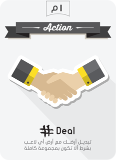 بهذا الكرت تستطيع تبديل أرضك مع أي أرض من ساحة أحد اللاعبين بشرط ألا تكون بمجموعة كاملة.